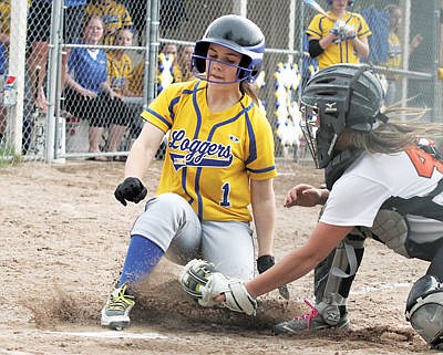 Madisen Monigold slides safely narrowly missing Ambryn Smith's tag, bottom of the third inning vs. Eureka Friday, April 22. (18-0 Libby)