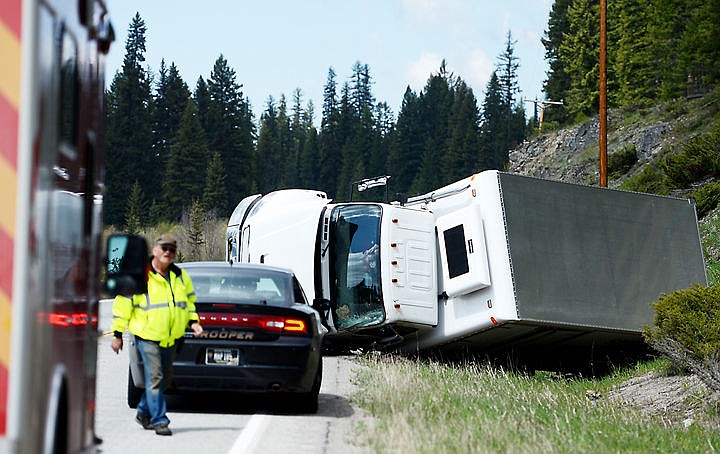 First responders from the Olney Volunteer Fire Department and the Montana Highway Patrol respond to the scene of a one vehicle rollover accident on U.S. 93 north of Olney on Wednesday afternoon, April 27. (Brenda Ahearn/Daily Inter Lake)