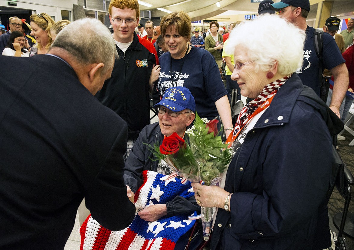 Post Falls' Larry Carstensen and his wife, Char, have attended six Honor Flight celebrations, including Tuesday's return for Coeur d'Alene resident Air Force and Korean War veterans George and Lee Periman.
