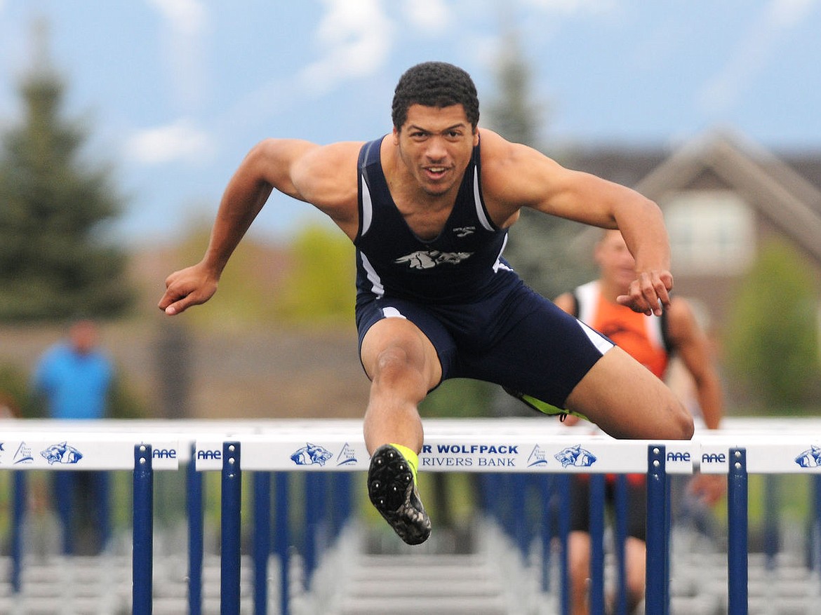 Glacier senior Aaron Robinson clears the final hurdle during his victory in the 110-meter hurdles at the Glacier track meet on Thursday. (Aaric Bryan/Daily Inter Lake)