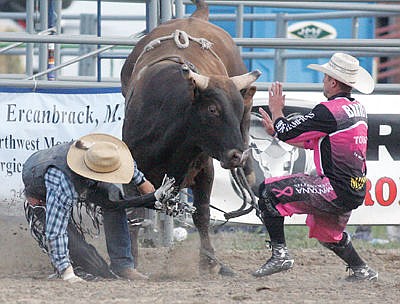 Bull fighter Kaleb Barrett, right, distracts "All Red" as Clay Applegate of Deer Lodge makes his escape during Saturday's edition of the 14th annual Kootenai River Rodeo. (Paul Sievers/The Western News)