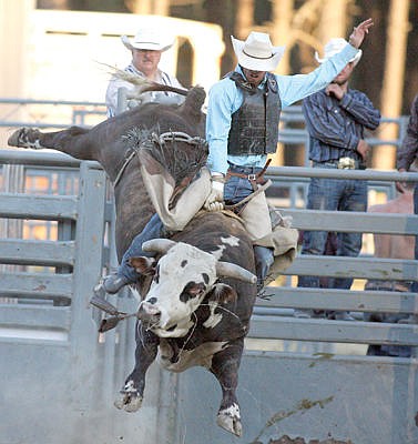 Dustin Jenkins of Missoula aboard "Navajo Joe" for a 75 point ride Friday night. (Paul Sievers/The Western News)