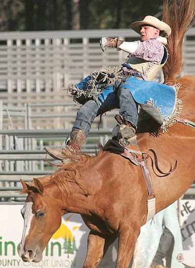 Trevor McAllister of Ronan was paired with "Silk & Dynomite" in the bareback riding in Saturday's edition of the Kootenai River Rodeo. (Paul Sievers/The Western News)