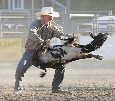 Will Powell of St.Ignatius turns in a tiime of 13.4 seconds in the tie down roping Friday night, good for third place and a check for $273. (Paul Sievers/The Western News)