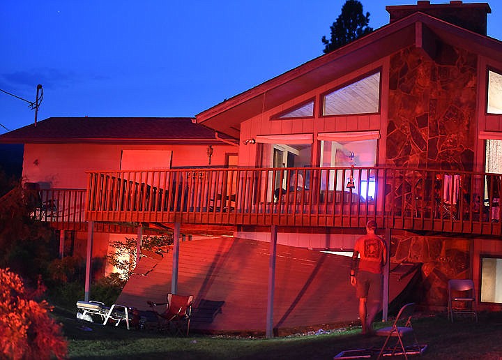 A home at 4 Lakeside Avenue is illuminated by the lights of emergency vehicles after a deck collapse that injured 11 people on Tuesday night. The deck railings were intact but the floor collapsed. (Brenda Ahearn/Daily Inter Lake)