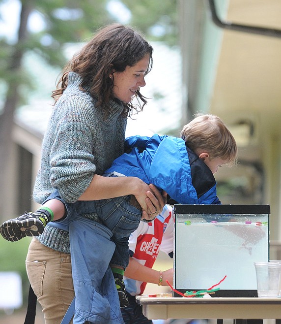 Tricia Youngblood holds her son Bennett as he tries to grab the contraptions people made in the phytoplankton display at the Flathead Lake Biological Station on Wednesday. (Aaric Bryan/Daily Inter Lake)