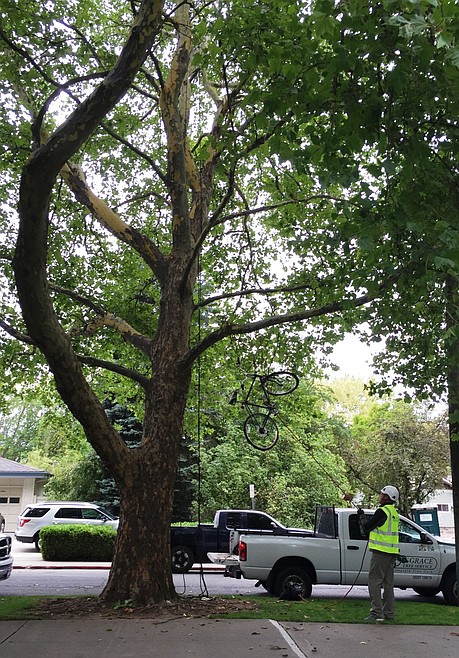 On Wednesday, Devon Braithwaite, Grace Tree Service general manager and a certified arborist, scaled the tree outfitted in complete safety gear and lowered the bike using ropes. The bicycle, an older-style Savannah Huffy, will be turned in to the police department.