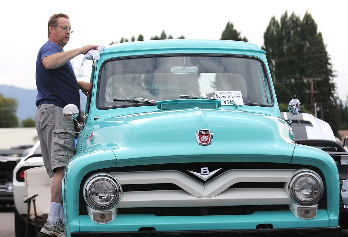 Dan Brockman shines his 1955 Ford F-100 during the Evergreen Show 'n Shine on Saturday. The truck originally was owned by Brockman's grandfather. (Aaric Bryan/Daily Inter Lake)