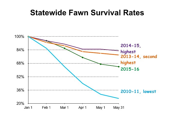Fish and Game captures and puts radio collars on mule deer fawns each winter, then tracks how many survive through mid-spring. Statewide survival of radio-collared fawns was 64 percent, which is down from a record-high 83-percent survival in the 2014-15 winter, and 78 percent the prior winter.