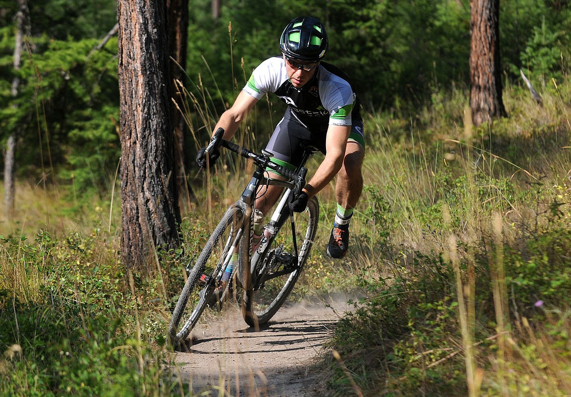 A biker rounds a corner during the Xterra Flathead Triathlon at Herron Park on Sunday. (Aaric Bryan/Daily Inter Lake)