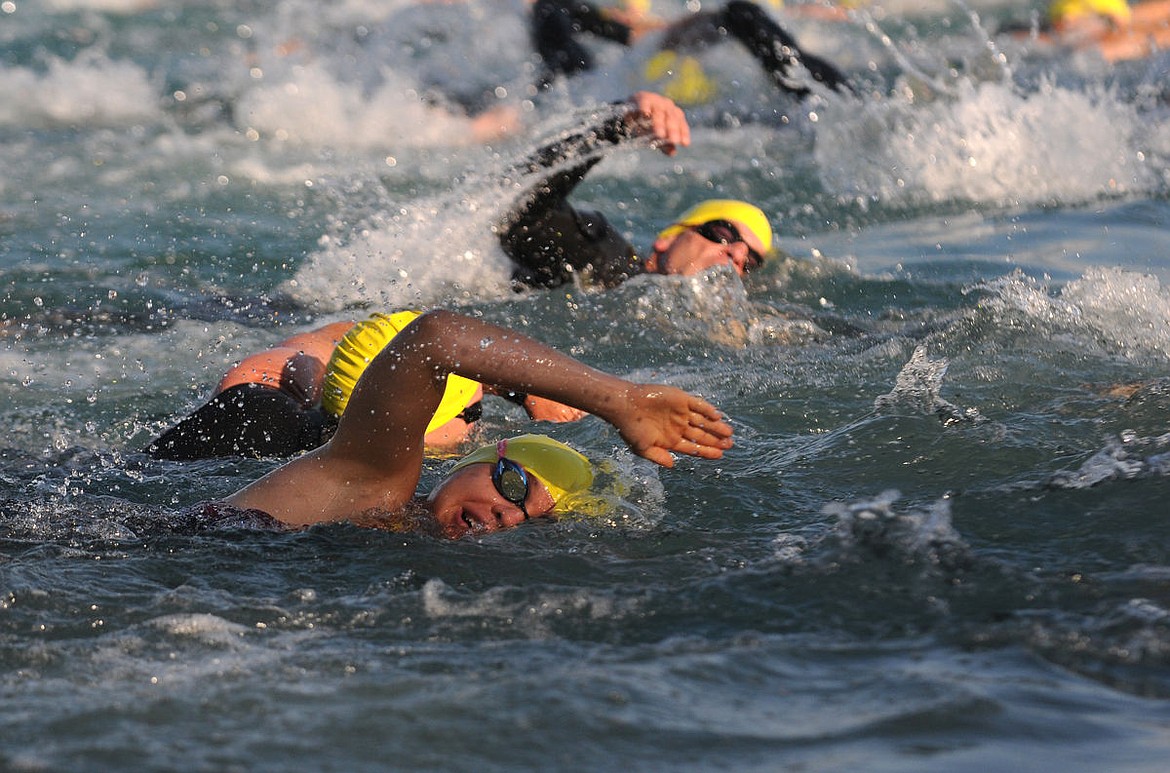 The swimmers in the Olympic division of the Xterra Flathead Triathlon start their swim in Foys Lake on Sunday. (Aaric Bryan/Daily Inter Lake)