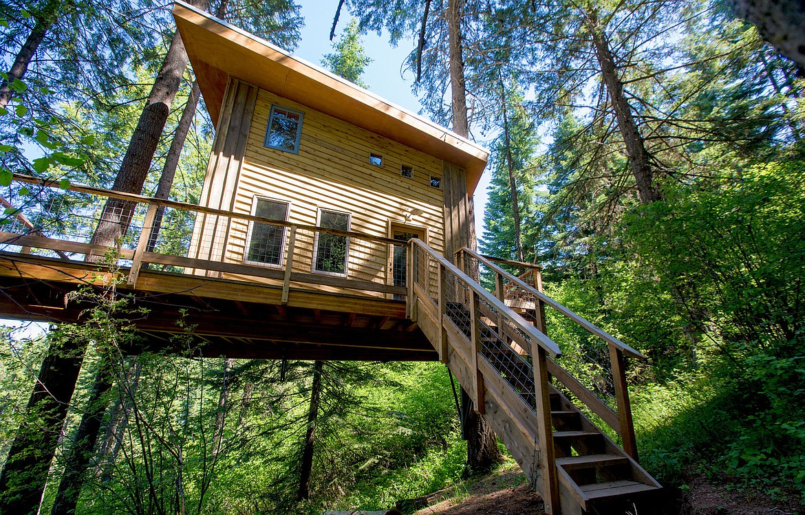 The sizable treehouse on the Buttars’ 117-acre property is supported by three Douglas firs and is nearly 30 feet from the ground. The main floor is furnished, featuring a couch and wood stove, and a loft with two beds and a small table.