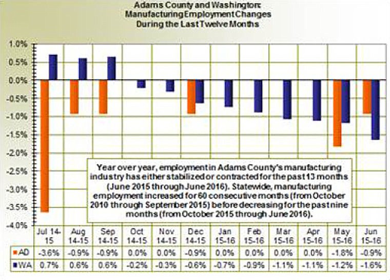 “Year over year, nonfarm employment in Adams County has decreased for the past 12 months, from July 2015 to June 2016,” wrote Don Meseck, regional labor economist for the Washington Employment Security Department. “In June 2016 there were 240 fewer nonfarm jobs in Adams County (5,720 jobs) than in June 2015 (5,960 jobs), a 4 percent downturn – certainly discouraging news for the local economy.”
