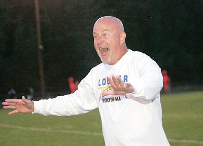 Coach Neil Fuller reacts after Erik Lauer scores a TD in the third quarter vs. Bonners Ferry Aug. 30, 2014. (Paul Sievers/The Western News)