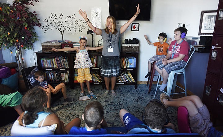 Erin Keithly leads the children as they practice the song on Thursday, July 28 at Pay It Forward Child & Family Services, Inc. in Kalispell. Pay It Forward is a non-profit that works with children offering therapeutic after school and summer programs as well as support groups. They have four fundraisers coming up beginning with the Basler Family Chiropractic event on August 24th. Additional fundraisers are going to be held at Kalispell Brewery from 5-8p.m. on August 30, and at Five Guys Burgers and Fries from 5-7 p.m. on September 13. Plans are in the works for a spaghetti dinner later in Septmeber. (Brenda Ahearn/Daily Inter Lake)
