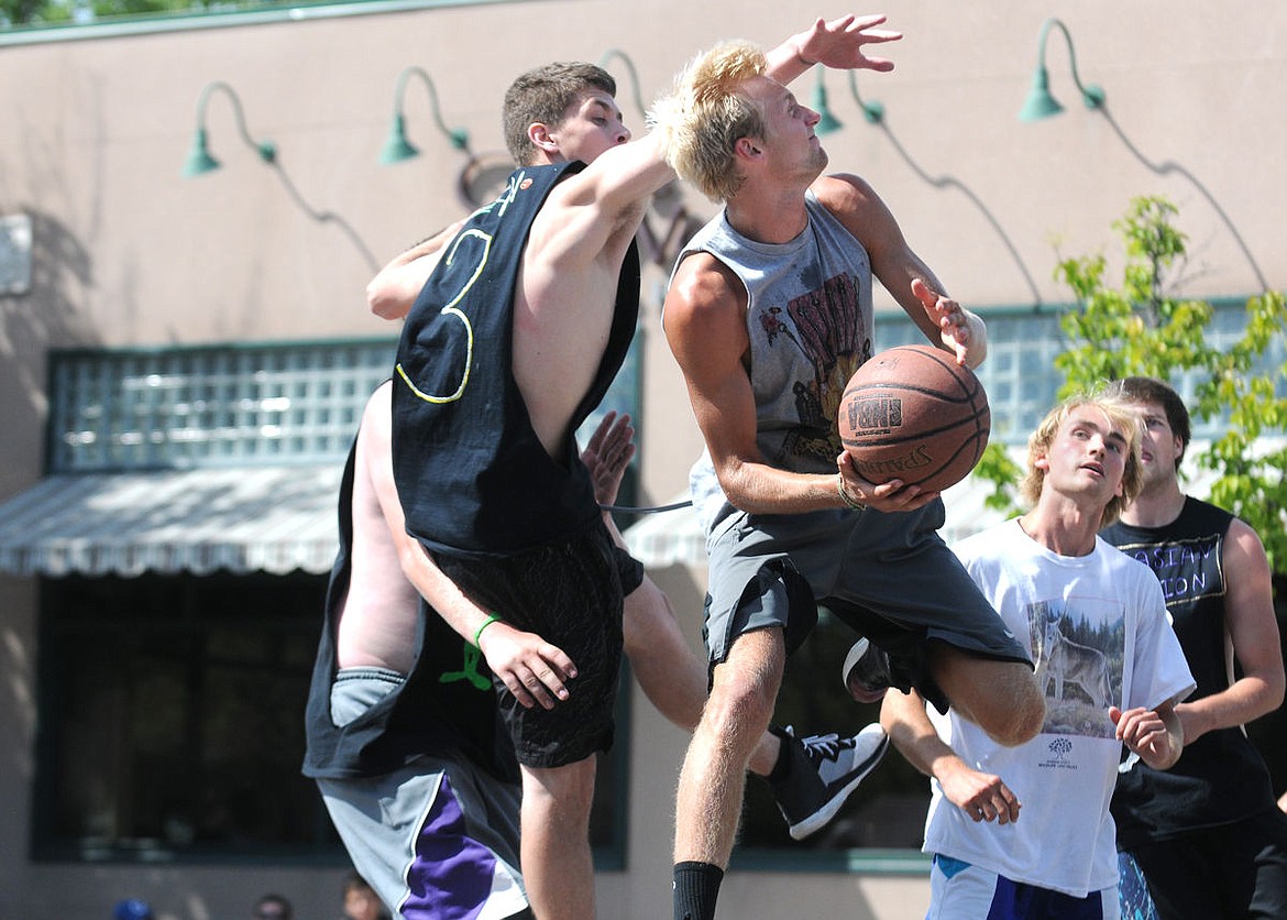 Ben Perrin goes up for a shot against Sam Bolster during a men's open game of the fourth annual Kalispell Firefighters 3-on-3 Tournament on Saturday. (Aaric Bryan/Daily Inter Lake)