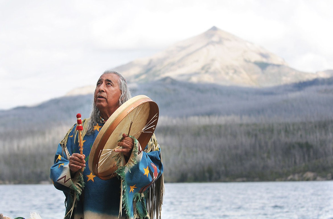 Dancing Thunder, the Principal Chief of the Susquehannock of the State of Florida, performs a song about the grizzly bear during a ceremony to honor the grizzly bear and bring attention to the proposed removal of the grizzly from the federal endangered species list at the Rising Sun pinic area in Glacier National Park on Friday. (Aaric Bryan/Daily Inter Lake)