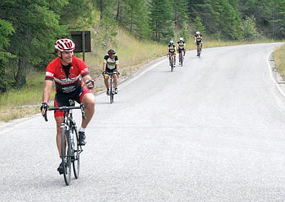 Jim Williamson of Coeur d’Alene, Idaho, followed by the Baddlands Cycling Club bicyclists. (Bethany Rolfson/The Western News)
