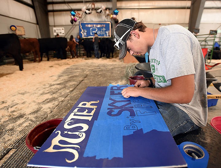 Skyler Farnes, 17, of Kalispell, making a poster for his steer “Mister” on Monday afternoon, August 15, at the Northwest Montana State Fair. Mister is a Black Angus/Hereford crossed will compete in showmanship and market class. (Brenda Ahearn/Daily Inter Lake)