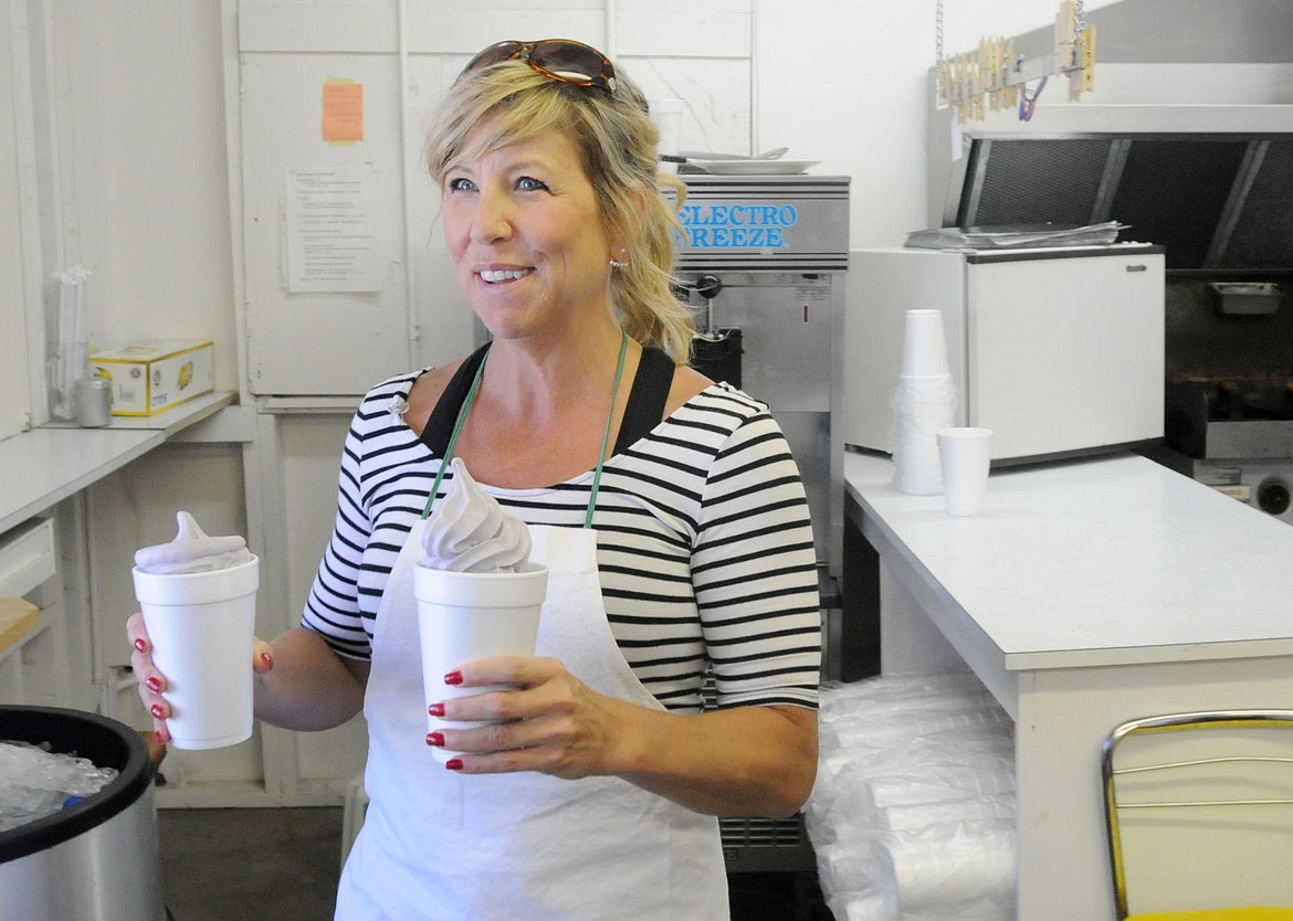 Diana Hinzmann brings a pair of huckleberry shakes to a customer at the Bigfork Ladies Service Club booth at the Northwest Montana Fair on Tuesday. (Aaric Bryan/Daily Inter Lake)
