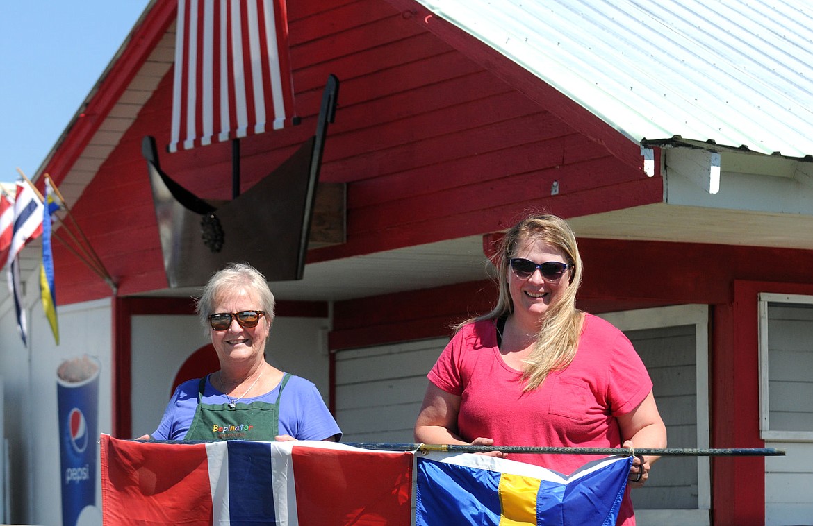 Emy Amy, left, and Mette Cephers stand in front of the Scandinavian Baking Company and Sons of Norway booth at the Northwest Montana Fair on Tuesday. They will make aebelskievers, Swedish pancakes and lefse. (Aaric Bryan/Daily inter Lake)
