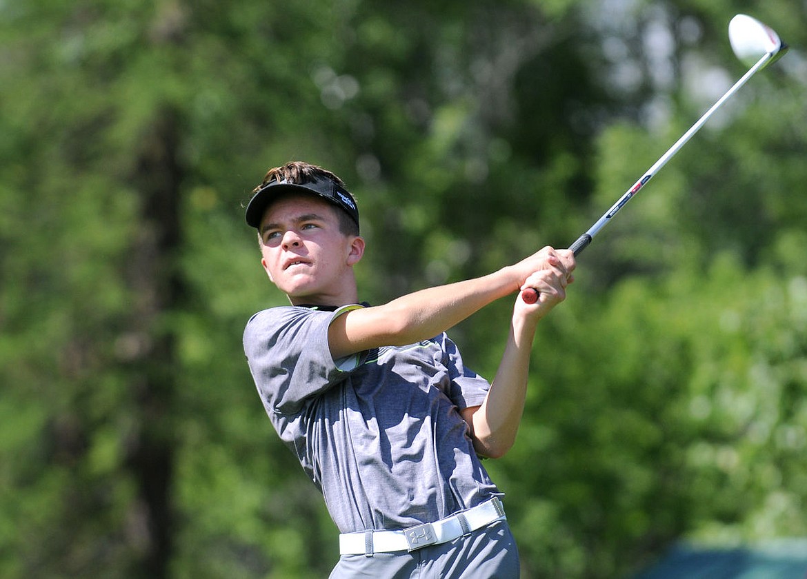 Whitefish sophomore Brendan Buls drives his tee shot on the 14th hole of the North Course at Whitefish Lake Golf Club during the Northwest A Kickoff tournament on Wednesday. (Aaric Bryan/Daily Inter Lake)