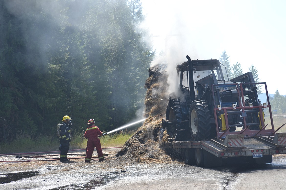 -- Photo by SARAH JENKINS Crews attempt to slow the flames on the semi-truck fire.