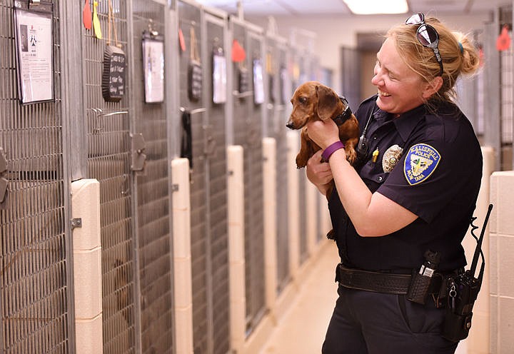 Animal Control Officer Niki Sevesind on Tuesday picks up a dog rescued from an Evergreen home on Monday. Saying she always had an affinity for “weiner dogs,” Sevesind stopped by the Flathead County Animal Shelter while making her rounds to see how the dogs were doing. The 15 dogs taken from the home after a small fire are not currently available for adoption. However, because of the influx of rescued dogs, the Flathead County Animal Shelter is waiving the adoption fee on dogs that have been at the shelter the longest and need good homes. (Brenda Ahearn photos/Daily Inter Lake)