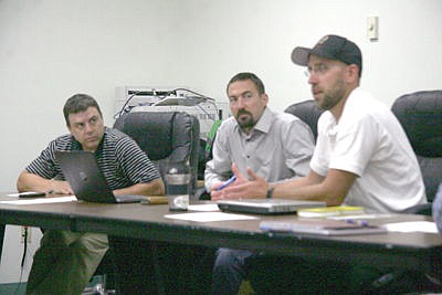 Superintendent of Libby Public Schools Craig Barringer and Johnson Controls, Inc Public Sector Account Executive Jake Terzo listen as Libby Ranger District District Ranger Nate Gassmann (right) explain why he thinks the benefits outweigh the obstacles of the biomass plant Tuesday afternoon. (Bethany Rolfson/The Western News)