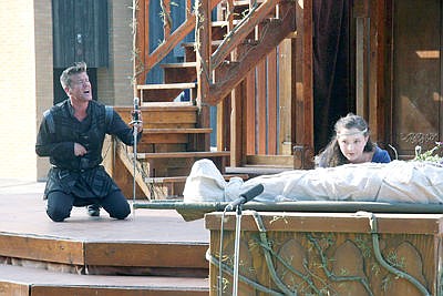 Richard III (Sam Pearson) trying to convince Lady Anne (Maeve Moynihan), that he loves her and that he did not kill her husband. "Thine eyes, sweet lady, have infected mine.” (Bethany Rolfson/The Western News)