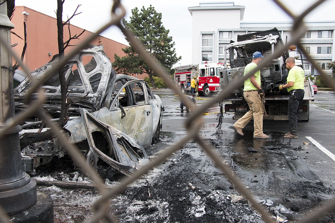 Four cars parked at the Shilo Inn were burned in the fire, most of which were burned completely, while another was only partially damaged.