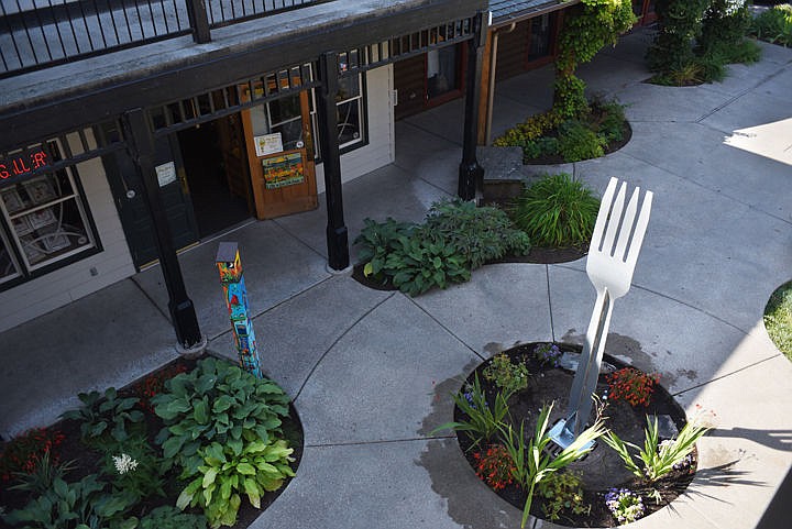 The newly erected Bigfork fork statue catches the afternoon rays in a shady courtyard in Bigfork, on Monday, August 29. The sculpture was designed by Dan Vigil of Vigil Steel. (Brenda Ahearn/Daily Inter Lake)