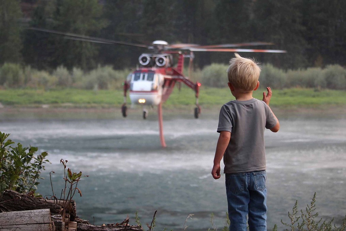 Weston Haun, 3, waves to the crew of a Sikorsky Skycrane on Wednesday as the helicopter gets water from the Clark Fork River for the firefighting effort on the Copper King Fire. (Bonnie Haun photo)