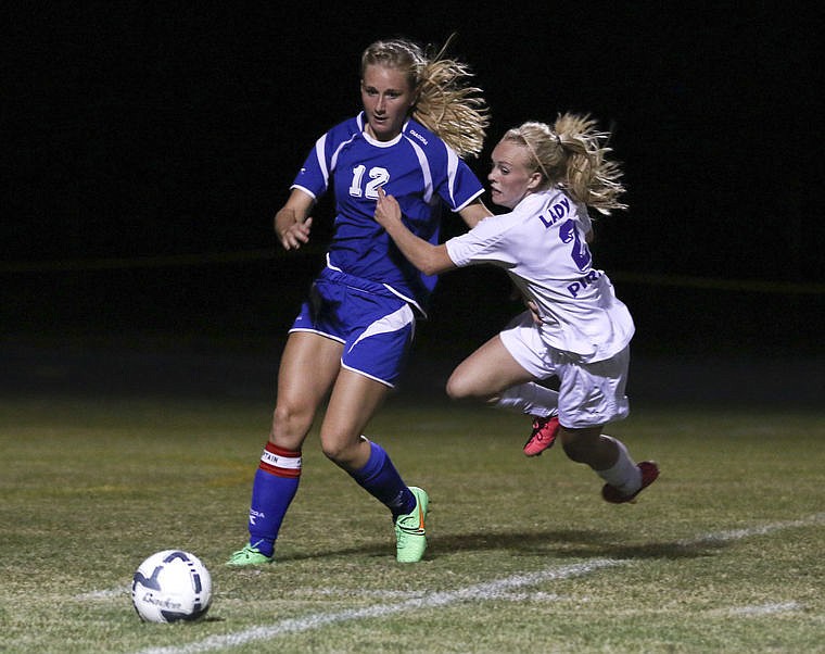 Polson's Tiara Duford tries to steal the ball from a Columbia Falls player in this file photo. (Kylie Richter/Lake County Leader)