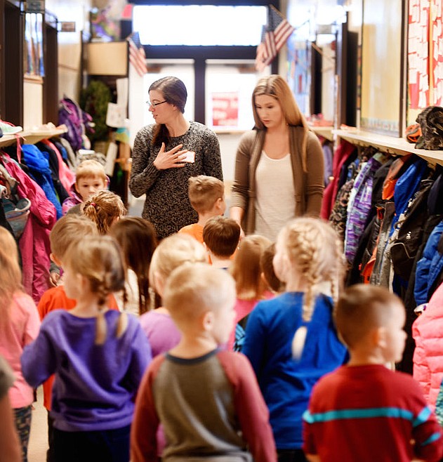 Teacher Amy Diem and Teaching Assistant Hillary Sprengle, lead preschool students down the hall on Thursday, December 1, at Cornelius Hedges Elementary. Thursday was the first day of the expanded preschool program at Hedges. (Brenda Ahearn/Daily Inter Lake)