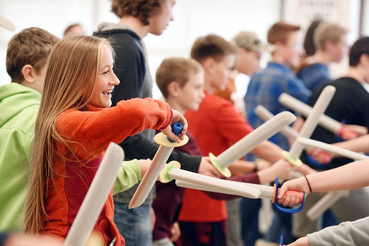 Kalispell Middle School eighth-grader Madison Becker smiles as she learn the art of stage combat in a workshop with performers from the Shakespeare in the Schools program on Friday, Dec. 2. The day began with a performance of "Hamlet" and continued with workshops including soliloquy, theatrical relevance/improv and fencing.