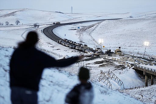 Law enforcement vehicles line a road leading to a blocked bridge next to the Oceti Sakowin camp where people have gathered to protest the Dakota Access oil pipeline in Cannon Ball, N.D., Saturday, Dec. 3, 2016. (AP Photo/David Goldman)