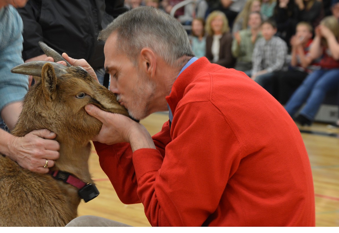 Following through on a years-old promise, Columbia Falls Junior High school principal Dave Wick and assistant principal John Cooper last Tuesday kissed a goat to honor the student body’s efforts in reaching their fundraising goal.