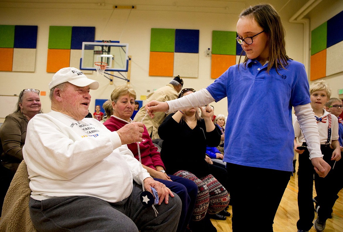 After the swing dance performance, students presented medals they had made to all of the veterans in attendance. The soup-can-top medals were painted red, white and blue and decorated with stars. Some said ‘Thank You,’ others read ‘U.S.A.’