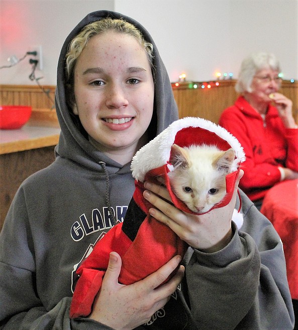 Missoula artist Karen Bergman had a table full of colorful paintings, and Zen rocks painted with dots and swirls. Her sister, who lives in Tarkio, was just a table away selling her own crafts. The local 4-H group had a table of yummy cinnamon rolls and other cookies and treats. There was even a kitten hiding in a Santa stocking named Arlo, who belonged to member Penny Foley. However, Arlo was not for sale, he was there just for show and moral support.