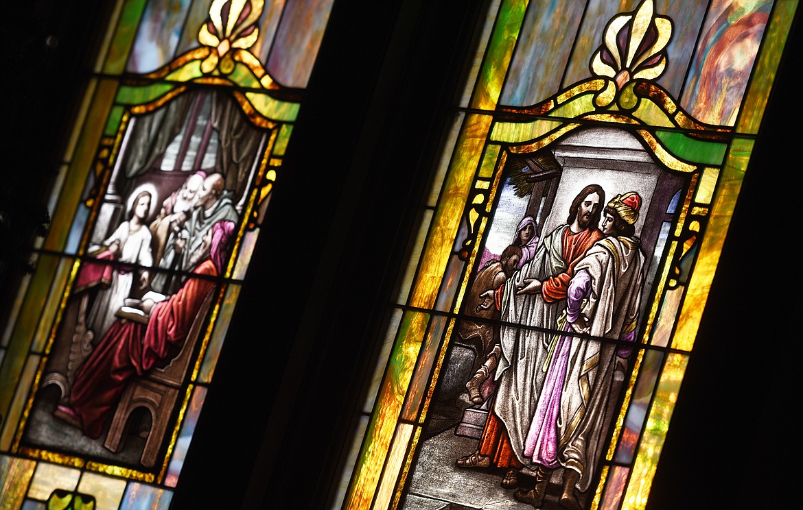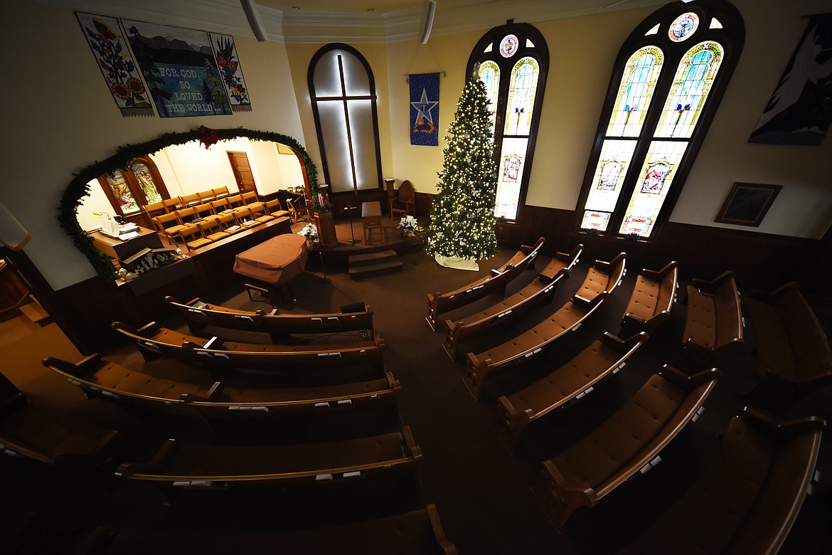 The historic stained glass windows at First Presbyterian Church in Whitefish tell the story of Christianity.