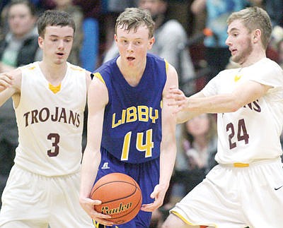 Dillon Savage, left, and Mason Chapel guarding Libby's Ryggs Johnston in fourth quarter Jan. 29.