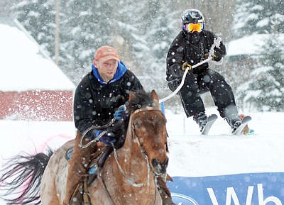 Matt Smart on horse Rojo pulls skier Austin Keiper at the Whitefish ski joring races Sunday. (Matt Baldwin / Whitefish Pilot)