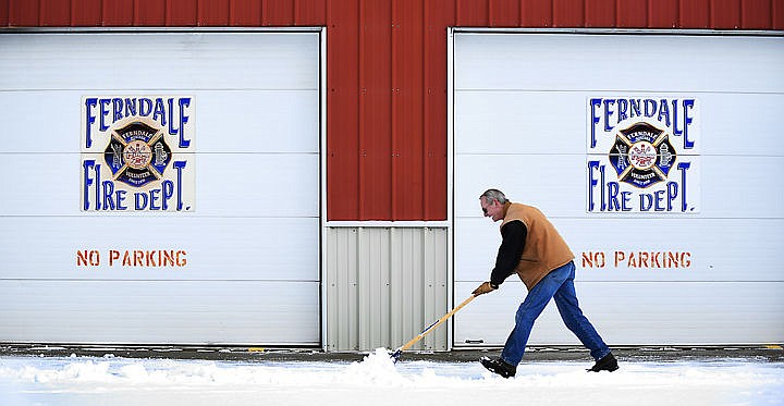 Fire Chief of the Ferndale Volunteer Fire Department Ken Sharr shovels snow from in front of the doors at the fire station on Monday morning, Feb. 1. Sharr said due to the height of the height of the vehicles, if there is even a small mound of snow the trucks can hit the top of the garage, keeping the space clear is everyone's responsibility.