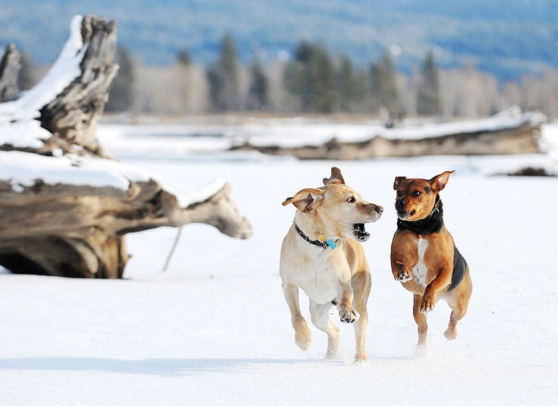 Rooster, left, and Beppo chase each other while playing in the snow on the beach of Flathead Lake near Somers on Monday. (Aaric Bryan/Daily Inter Lake)