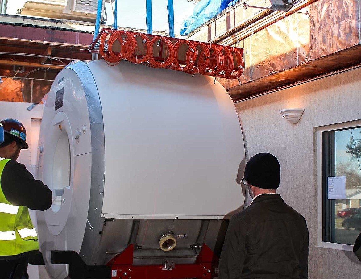 Off came the roof, or at least a section of the roof, and up went the unit – the $1.2 million MRI unit, dangling from straps. Fletcher admitted to a little nervousness as the unit was lifted over the building and lowered into place.