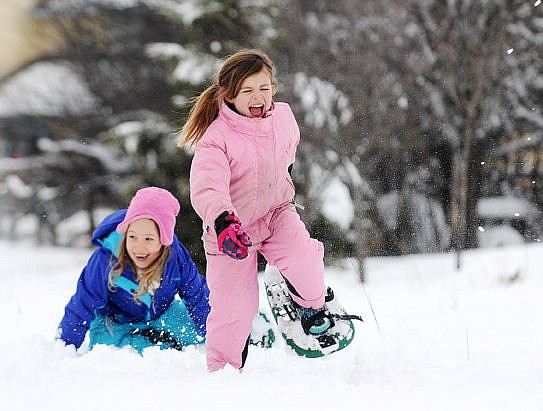 Kalispell Montessori first-grader Luciana Kress runs past Hana Houston while playing a game of "run and scream" during a outdoor learning experience with snowshoes on Thursday. (Aaric Bryan/Daily Inter Lake}