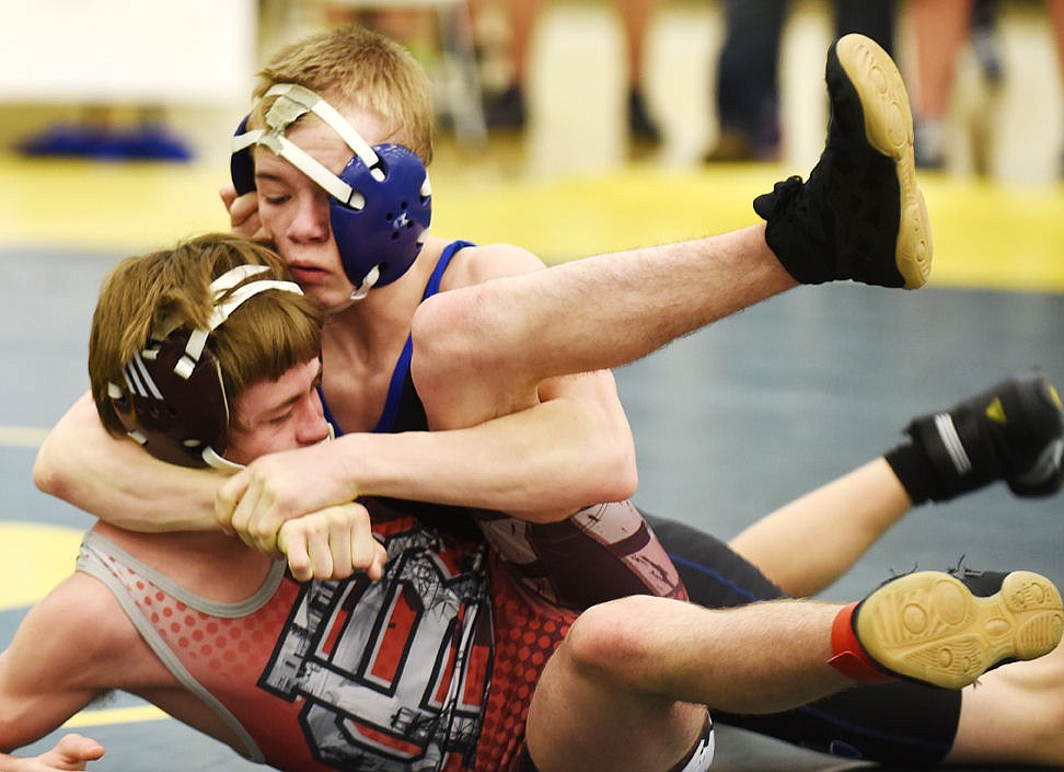 Columbia Falls' Austin Nelson secures a cradle hold to pin Butte Central's Roy Russell during the final seconds of the first period of the 103-pound match at Western A divisional tournament in Whitefish on Friday. (Aaric Bryan/Daily Inter Lake)