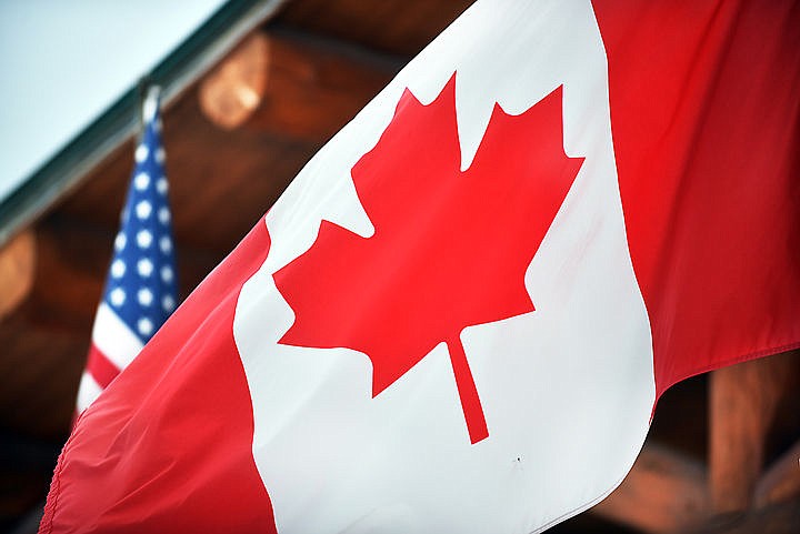 A Canadian flag blows in the wind outside Majestic Valley Arena on Friday morning, Feb. 5, north of Kalispell. (Brenda Ahearn/Daily Inter Lake)