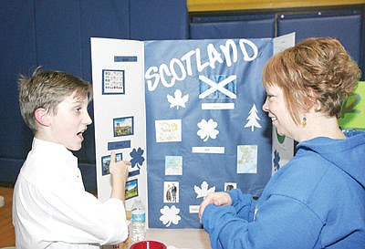 Billie Jo Jones, right, learns all about Scotland from seventh-grader Josh Troyer Friday afternoon during Festival of Nations 2016 at Libby High School.
